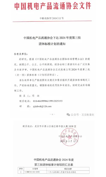 2024年3月13日,中機(jī)電協(xié)字【2024】12號《中國機(jī)電產(chǎn)品流通協(xié)會(huì)下達(dá)2024年度第三批團(tuán)體標(biāo)準(zhǔn)計(jì)劃的通知》,下達(dá)了中機(jī)電協(xié)團(tuán)標(biāo)《二手工業(yè)機(jī)器人質(zhì)量評估技術(shù)規(guī)范》編制計(jì)劃。計(jì)劃號:T/CMEPCA-010-2024。